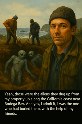 Yeah, those were the aliens they dug up from my property up along the California coast near Bodega Bay. And yes, I admit it, I was the one who had buried them, with the help of my friends. Had to. They were dead, and we didn’t have enough freezer space to hold them. Also, we wanted to honor them, and NOT let the government cut them up to learn their secrets. But they did that anyway. And they took the spaceship from me. Yet there was another who survived, and it’s her story I want to share with you.
